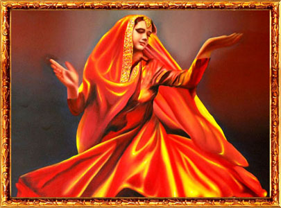 A "Kathak" dancer twisting to the sound of intense music. A choreography of colours blended to the rhythmic music of Kathak. The colourful attire and fast-paced movements are peculiar in this traditional Indian dance form. The young dancer is poised in her actions. She is submerged in the background music and the surroundings slowly vanishes away. The contented feel and look on her face is created with a master touch. The garments are painted with such perfection that one can hear the sound of rich silk flowing in harmony with the music. Unveiling this painting on 29/9/2007. Judge V. Giri of High Court of Kerala, India said “Prem’s works are exquisite pieces of art with a new style, idea, vision and voice. His art is god’s gift in its profundity."