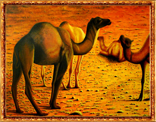 A panoramic view of the twilight washed desert. The golden twilight of the setting sun glitters the desert sand, its pebbles and tiny grass around. The shadows it create mystifies the viewer’s perception. The camels are enjoying the soothing aura of the twilight. Your eyes tantalize between the camels and the back ground, the magical golden hue of the twilight and the shadows it create. The three dimensional effect created in every object in the picture is the result of the dedication the artist took to play with light and shades. Camels in the Twilight ZoneAcrylic on canvas 2008 (Size "36 x 48") |