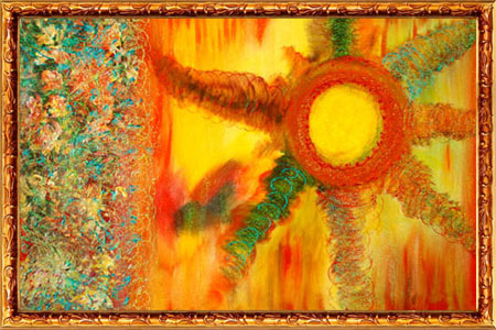 An artistic rendering of the Vedic exposition of Sun. Sun is the embodiment of everything we see. It is promulgated in the vedas that the sun has seven different arms, each represents different energies. The person who understands that knowledge can control and utilise those different energies. The seven hands of sun as the different powers around is expressed in the painting with swirling brush effect to create the bursting power. The cosmic colours of galaxies, expressed in 3D embossed colours with knife effects is shown in the left side of the painting. The seven hands of sunAcrylic and Giltters on Canvas 2007 (Size 24"x 36") |