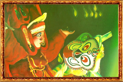 The folklore tradition of Kerala is well known for its extravaganza of colours and motifs. The artist is much delighted in painting the folklore themes. Here the exuberant and psychedelic colours of the Theyyam and the strong light effect of the "Pandam", which is outside the farm are the prim attractions. A good theme to show in a drawing room or a chairman’s cabin where command and rule is essential. The belief is that Theyyam has a power to ward off the evil or black energy in a room or the mind of the person. It instills extreme power to rule in the mind of the person who displays it. The motif in the right side is crafted by tender coconut leaves and aracanut leaves by artisans according to folklore tradition. True to life colours are specially formulated to paint this art piece. Watch the three dimensional effect in the motifs and the play of light. Theyyam with PadayaniOil on canvas 2007 (Size "24 x 36") |