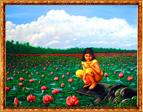 A Panoramic view of a vast lotus pond filled with thousands of flowers and floating leaves. Nature’s own palate of colours in its brightest form, the green in the leaves, the red in the flowers, the blue in the sky, the white in the clouds and the black in the rocks, capture the hearts. The rocks covered with creepers and weeds make a curved entry into the pond. Who will not want to sit on that rock and pluck a lotus from the water ? The blooming flowers in the morning sun and the little child portray a picture of innocence and beauty. The clouds in the background and the infinite blue sky make a strategic contrast to the colours applied below. This picture conveys a message of nature conservation also. "If the so-called development goes on like this, will there be any green left for our children ?" asks the artist. Preserving this beautiful nature should be the prime motto of every human being.