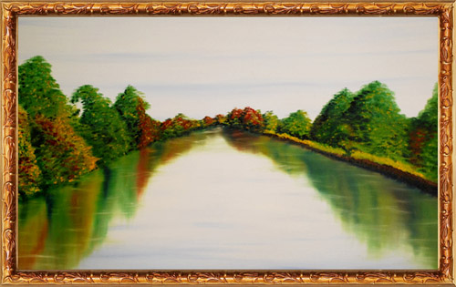The calmness of a slowly flowing river and the reflections of trees and the sky in it are always a fascination for me. The psychological impact it creates has a very positive effect. A very suitable picture to place in the bed room, or in the drawing area. Long brush strokes were applied to blend blue and white for the skies and water. The trees are painted with puffing techniques by brush and knife. The reflections of the trees in the river is painted with soft down strokes. Prem is happy to see some art lovers touch the water with their fingers to feel it . A catch of realism with the effect of impressionism. If this beautiful nature be there for ever. Reflections in The flowing riverOil on Canvas 2008 (Size "24 x 36") |